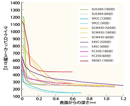イソナイト処理によってもたらされる表面硬度、硬化層深さはそれぞれの材料に依存します。